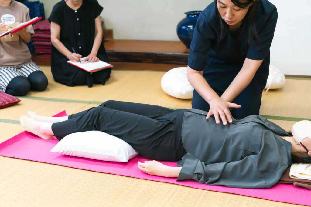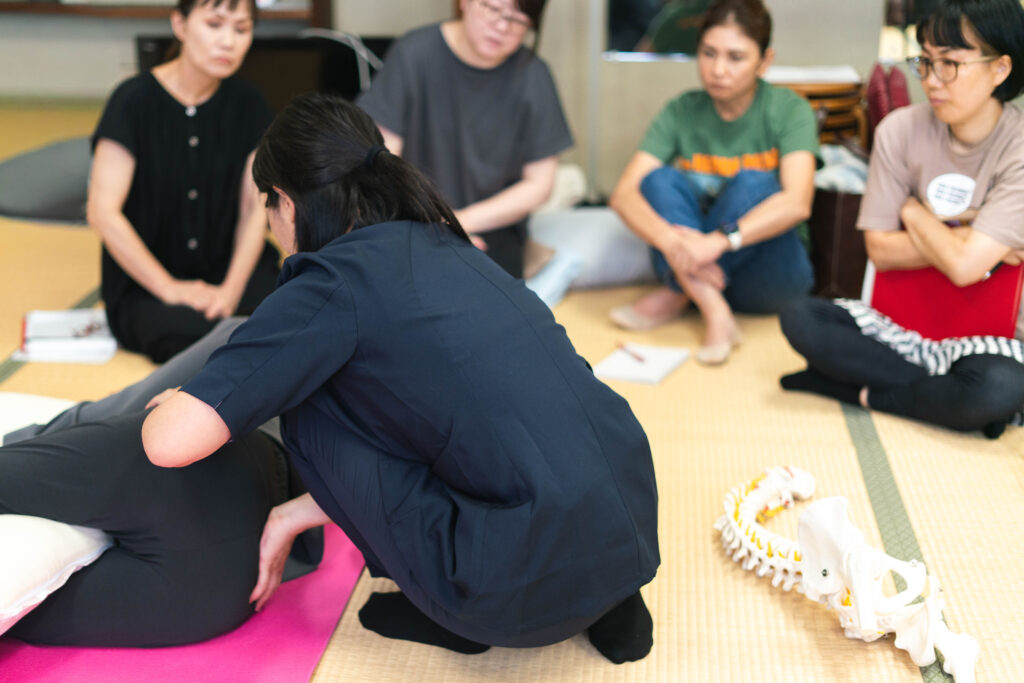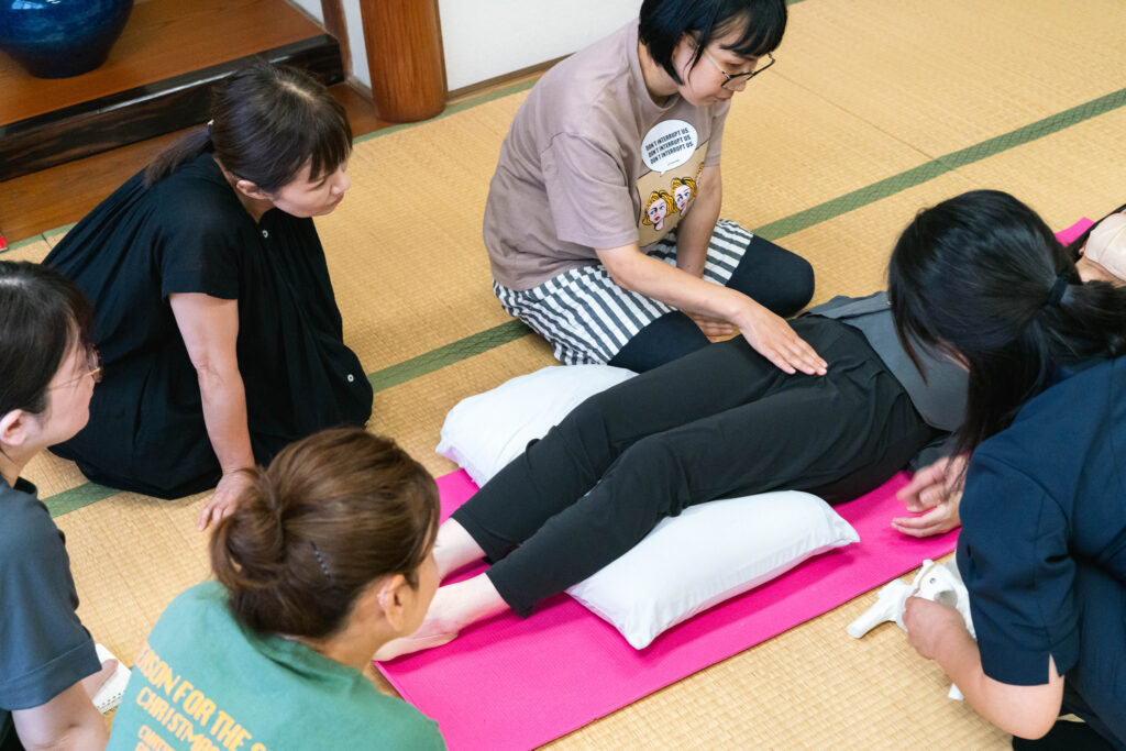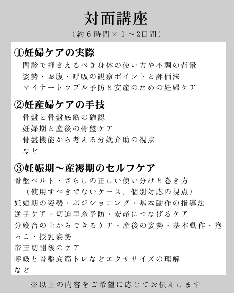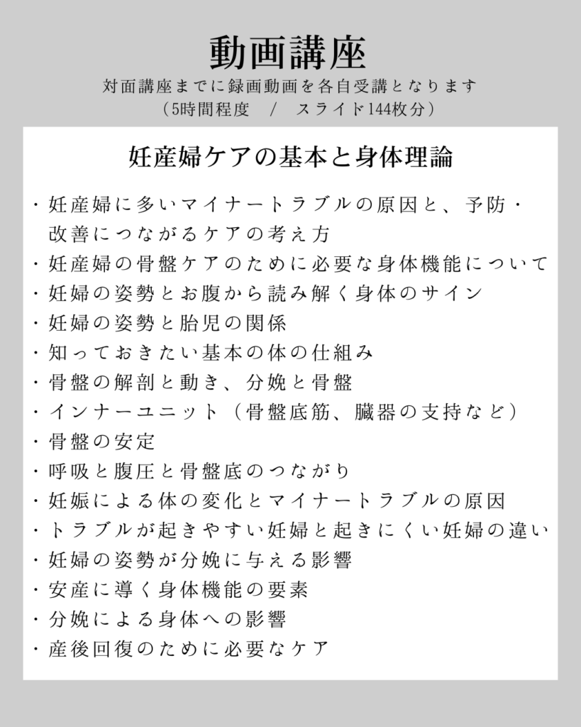 ①~③の内容で行います。ママたちの身体を実際にケアする際の手技(骨盤や腹部の調整など)を習得したい方向けの内容となります。