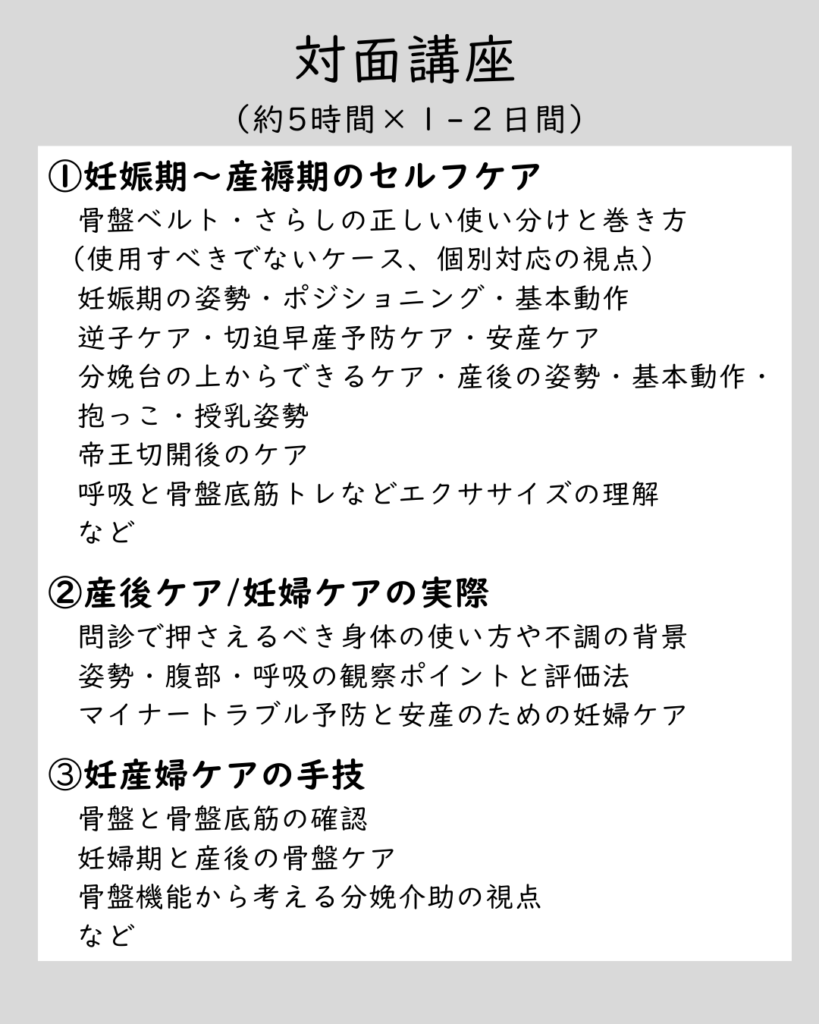 ①~③の内容を中心に行います。セルフケアに加え、ママたちの身体を実際に評価・ケアする際の手技(骨盤や腹部の調整など)を習得したい方向けの内容となります。