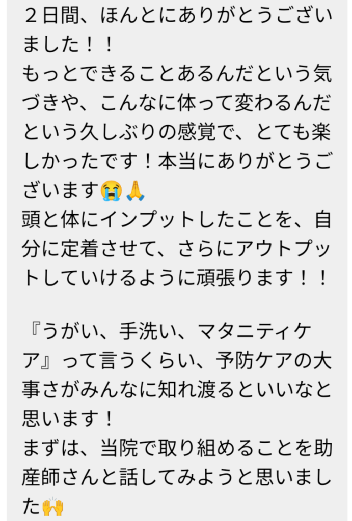 今後はこちらの講座の受講生限定での妊婦ケア講座も別途開催します。